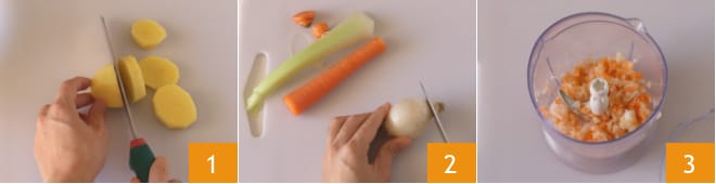 Pour réaliser la crème de pommes de terre et lentilles au curry, commencez par préparer le bouillon de légumes, puis épluchez et coupez les pommes de terre en tranches 1. Nettoyez le céleri, la carotte et l'oignon 2 et coupez-les grossièrement en morceaux, puis mettez-les dans un mixeur et hachez-les finement 3.