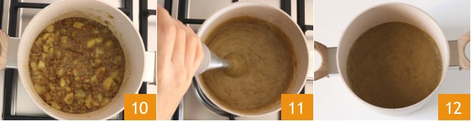 Après ce temps 10, mixez le tout avec un mixeur plongeant 11. Votre crème de pommes de terre et lentilles au curry est prête à être servie bien chaude 12, assaisonnée d'un filet d'huile d'olive cru !