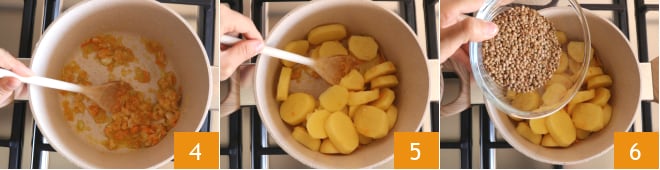 Versez le hachis obtenu dans une casserole avec l'huile et faites revenir pendant 2 minutes 4, puis ajoutez les pommes de terre et faites-les revenir pendant environ 3 minutes, en remuant de temps en temps 5. À ce stade, ajoutez les lentilles que vous aurez préalablement rincées sous l'eau courante 6.