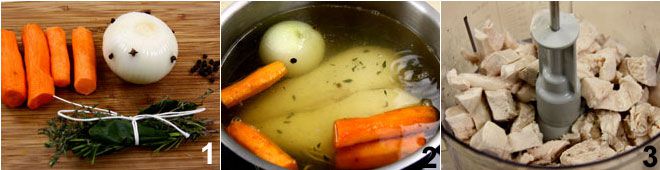 Pour préparer la crème de poulet, commencez par placer dans un litre et demi d'eau deux carottes lavées, épluchées et coupées en deux, un oignon piqué avec les clous de girofle, le laurier, le romarin et le thym réunis en un bouquet garni attaché avec de la ficelle de cuisine et les grains de poivre 1. Portez à ébullition et faites cuire pendant environ 20 minutes. Salez le bouillon et ajoutez le blanc de poulet qui devra cuire pendant 20 minutes, jusqu'à ce qu'il soit complètement blanc à l'intérieur 2. Retirez le poulet du bouillon, égouttez-le, laissez-le refroidir et enlevez les os et le cartilage, en coupant la chair en petits morceaux 3.