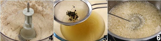 Hachez ensuite finement la chair avec un demi-verre de bouillon dans un mixeur 4. Filtrez le bouillon de poulet avec une passoire pour éliminer les légumes et les arômes et mettez-le de côté 5. Dans une casserole, mettez la mie de pain finement émiettée et ajoutez un demi-litre du bouillon obtenu 6, mettez sur le feu et remuez jusqu'à ce que le bouillon s'épaississe, ajoutez le poulet haché et mélangez bien pour amalgamer le tout.
