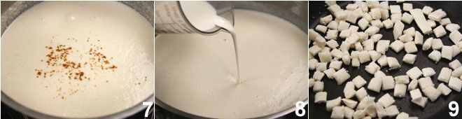 Ajustez éventuellement le sel et ajoutez une pincée de noix de muscade 7. Passez à nouveau la crème dans le mixeur, pour la rendre veloutée et éliminer les grumeaux. Pour compléter la crème de poulet, ajoutez la crème fraîche 8 et décorez avec une feuille de persil ou de la ciboulette et des croûtons de pain de mie légèrement grillés à la poêle avec un filet d'huile 9.