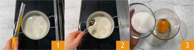 Pour préparer la crème frite, commencez par chauffer le lait avec le zeste de citron râpé 1 et l'extrait de vanille 2. Pendant ce temps, mélangez les jaunes et le sucre dans un bol à part 3 (conservez les blancs pour la panure).