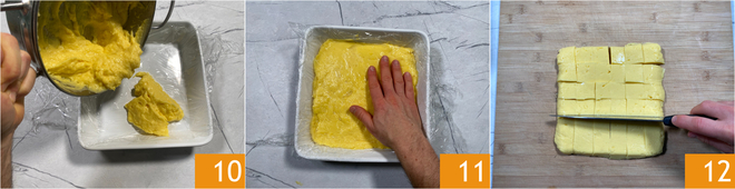 Transférez la crème dans un moule de 20x20 cm tapissé de film alimentaire 10, couvrez également la surface avec du film et tassez pour lisser uniformément 11. Laissez refroidir au réfrigérateur pendant au moins 2 heures. Après le temps de refroidissement, démoulez la crème bien prise sur la planche et découpez 36 cubes 12.