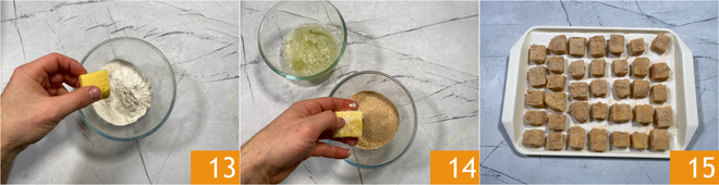 Passez les cubes d'abord dans la farine 13, puis dans les blancs réservés et enfin dans la chapelure 14. Disposez-les au fur et à mesure sur un plateau recouvert de papier cuisson 15.