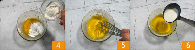 Ajoutez la farine et la fécule 5, puis mélangez délicatement au fouet 5. Détendez avec quelques louches de lait chaud 6.