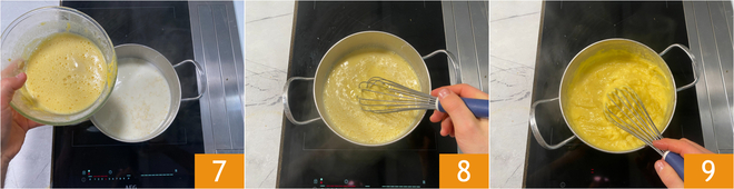 Versez ensuite le mélange dans la casserole avec le lait 7 et faites cuire en remuant continuellement au fouet 8 jusqu'à obtenir une crème dense et compacte 9.