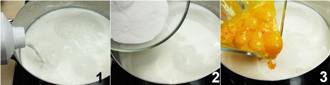 Pour préparer la glace à la crème, versez le lait dans une casserole 1 et ajoutez le sucre 2; mélangez et ajoutez les jaunes d'œufs 3 puis fouettez avec un fouet.