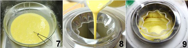 Plongez la casserole dans de l'eau glacée pour abaisser rapidement la température 7; pendant cette opération, mélangez toujours le mélange. Lorsque le mélange est froid, laissez-le reposer au réfrigérateur pendant au moins deux heures. Avant d'insérer le mélange dans la sorbetière, placez-le au congélateur jusqu'à ce qu'il devienne très froid mais encore liquide. Versez le mélange dans une sorbetière 8 et laissez-la travailler jusqu'à obtenir une belle glace dense et crémeuse 9. Versez la glace dans un récipient avec couvercle et laissez-la durcir au congélateur pendant au moins 3-4 heures avant de la consommer (il serait préférable de la laisser toute une nuit).