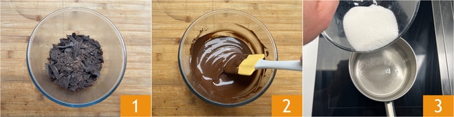 Pour préparer la crème pour pandoro au chocolat, commencez par hacher le chocolat noir au couteau et mettez-le dans un bol 1. Faites fondre le chocolat au micro-ondes ou au bain-marie 2 et laissez-le tiédir. Dans une petite casserole, versez l'eau et le sucre 3, puis faites chauffer jusqu'à atteindre une température de 121°C.