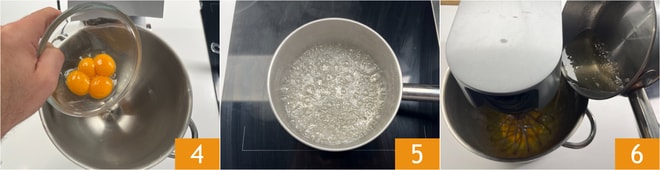 Entre-temps, mettez les jaunes d'œufs dans le bol du batteur sur socle 4. Si vous n'avez pas de thermomètre de cuisine, vous saurez que le sirop est à température lorsqu'une mousse blanche se forme à la surface 5. Commencez à fouetter les jaunes et versez le sirop chaud en filet 6. Continuez à fouetter pendant 5 minutes, jusqu’à refroidissement du mélange.