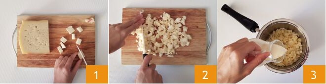 Pour réaliser la crème salée aux champignons et lardons, commencez par couper l'Asiago en dés 1 puis hachez-le au couteau 2. Transférez le fromage dans une casserole, ajoutez le lait et la crème 3