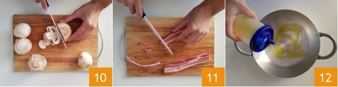 Coupez finement les champignons 10 puis coupez les lardons en dés 11. Versez un filet d'huile dans une poêle 12