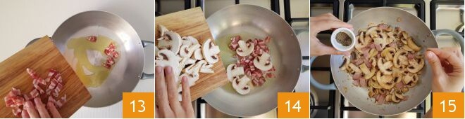 Ajoutez ici les dés de lardons 13 et transférez le tout sur le feu, chauffez à feu doux puis ajoutez également les champignons 14. Poursuivez la cuisson pendant 10 minutes. Assaisonnez de poivre 15 et réservez.