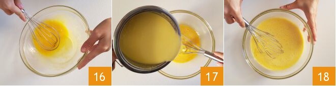 Dans un bol, battez les jaunes de 5 œufs avec l'œuf entier 16, incorporez le mélange à la crème désormais froide 17 et mélangez bien pour amalgamer 18.
