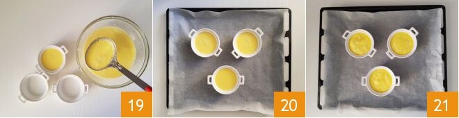 Maintenant, répartissez le mélange dans des cocottes allant au four 19, posez-les sur une plaque 20 et faites-les cuire dans un four ventilé préchauffé à 150° pendant 20 minutes dans le niveau du milieu. Une fois ce temps écoulé, retirez les cocottes 21
