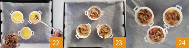 Garnissez-les de champignons et de lardons (22-23) et remettez au four encore 20 minutes. Une fois ce temps écoulé, la crème salée aux champignons et lardons sera prête à être dégustée 24.