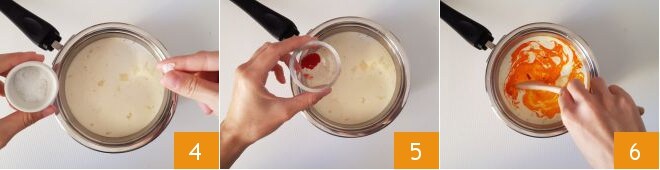 Ajoutez une pincée de sel 4, le safran en poudre 5 et mélangez avec une cuillère 6.
