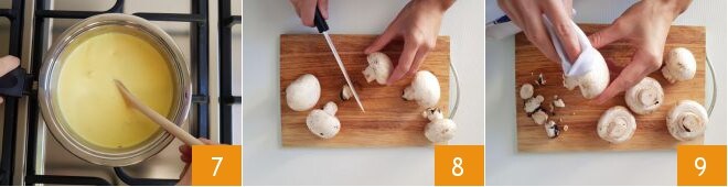 Placez la casserole sur le feu et faites cuire le mélange à feu doux pendant environ 15-20 minutes, en veillant à mélanger souvent. Vous devez obtenir une crème homogène 7 pas trop épaisse, réservez-la pour qu'elle refroidisse. Maintenant, nettoyez les champignons : éliminez la partie terreuse du pied 8 et frottez-les délicatement avec un chiffon 9.