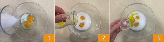 Pour préparer les crêpes sans lactose, commencez par casser les œufs dans un bol, puis ajoutez le lait de coco 1, l'huile 2 et une pincée de sel 3.