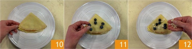 Pliez la crêpe en deux puis encore en deux, pour former un triangle 10. Garnissez de myrtilles 11 et d'amandes effilées 12.