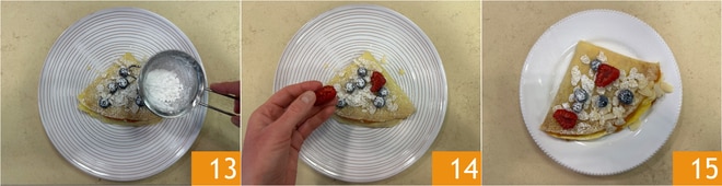 Enfin, complétez avec une pincée de sucre glace 13 et des framboises 14. Vos crêpes sans lactose sont prêtes à être dégustées 15 !