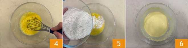 Mélangez avec un fouet 4. Ajoutez la farine 5 et mélangez à nouveau pour l'incorporer uniformément et obtenir un mélange lisse et sans grumeaux 6.