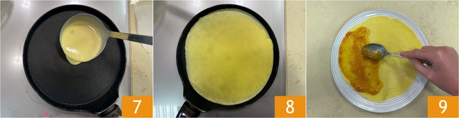 Chauffez une crêpière de 18 cm de diamètre (ou une poêle antiadhésive de même taille) et graissez-la légèrement avec de l'huile, puis versez une louche de pâte au centre 7. Faites tourner la poêle pour la répartir uniformément jusqu'aux bords 8. Faites cuire à feu moyen-doux pendant 2 minutes de chaque côté. Procédez ainsi jusqu'à épuisement de la pâte ; avec ces quantités, vous obtiendrez environ 6 crêpes. Au fur et à mesure que les crêpes sont cuites, empilez-les sur une assiette ou sur du papier sulfurisé. Garnissez les crêpes comme vous le souhaitez : par exemple, vous pouvez étaler votre confiture préférée sur la moitié de la surface 9.