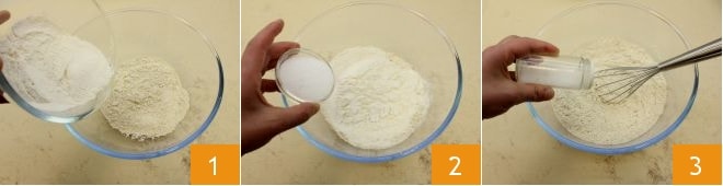 Avant de commencer à préparer les crêpes à la farine de châtaigne avec mascarpone et ganache au chocolat, assurez-vous de faire fondre puis tiédir le beurre. Commencez donc par la pâte des crêpes : mettez la farine 00 et celle de châtaigne tamisées dans un grand bol aux bords hauts 1, ajoutez le sucre 2 et la pincée de sel 3.