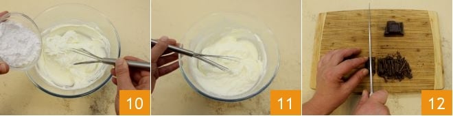 Puis ajoutez le sucre glace tamisé, en continuant de mélanger 10. Une fois prête 11, couvrez la crème au mascarpone avec un film plastique en contact et placez-la au réfrigérateur pour reposer. Pendant ce temps, préparez la ganache au chocolat : dans une petite casserole, faites chauffer la crème fraîche et en même temps, hachez grossièrement le chocolat noir avec un couteau 12.