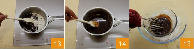 Dès que la crème frôle l'ébullition, éteignez le feu et ajoutez le chocolat que vous avez coupé. Mélangez avec une cuillère en bois pour amalgamer les ingrédients 13 et, lorsque le chocolat est complètement fondu 14, faites refroidir la ganache en la plaçant au bain-marie dans un bol rempli de glace; avec un batteur électrique, travaillez la ganache pendant environ 10 minutes pour qu'elle devienne crémeuse, dense et brillante 15 et mettez de côté.