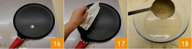 Une fois le temps écoulé, faites chauffer une noix de beurre dans une poêle antiadhésive de 26 cm de diamètre 16, en le répartissant sur toute la surface avec une feuille de papier 17. Sortez la pâte à crêpe du réfrigérateur 18