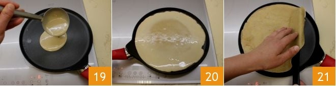 Et versez une louche de pâte au centre de la poêle 19, en la tournant pour qu'elle se répartisse uniformément sur toute la surface 20. Laissez cuire la crêpe d'un côté pendant quelques minutes, puis retournez-la délicatement avec une spatule 21, en la laissant cuire aussi une minute de l'autre côté.