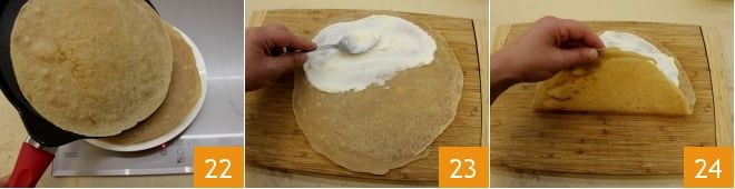Transférez les crêpes prêtes sur une assiette et empilez-les les unes sur les autres 22, en répétant l'opération jusqu'à épuisement de la pâte : avec ces quantités, vous obtiendrez 8 crêpes. À ce stade, prenez une crêpe et avec une cuillère, garnissez-la à moitié avec la crème au mascarpone 23; pliez-la en demi-lune 24