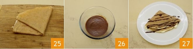 Et pliez-la encore en deux 25; dressez sur un plat de service et décorez à votre goût avec la ganache 26. Servez les crêpes à la farine de châtaigne avec mascarpone et ganache au chocolat bien chaudes 27.