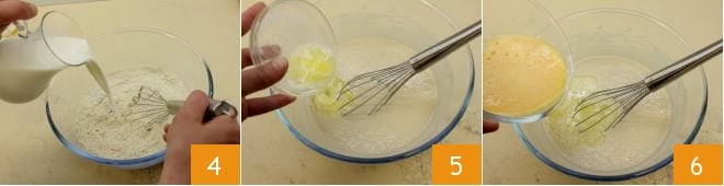 Versez le lait en filet en mélangeant bien avec le fouet pour éviter la formation de grumeaux 4, puis ajoutez le beurre fondu et tiédi 5. Dans un petit bol, battez les œufs et ajoutez-les ensuite au mélange 6.