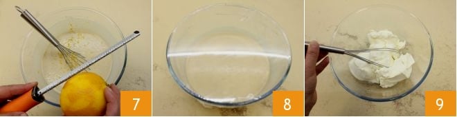 Ajoutez également le zeste d’orange râpé 7 et mélangez pour bien amalgamer les ingrédients jusqu'à obtenir une pâte lisse et homogène; placez la pâte au réfrigérateur pour reposer pendant au moins 30 minutes, couverte de film plastique 8. Pendant ce temps, préparez la crème au mascarpone : dans un bol, mélangez le mascarpone avec le fouet pour l'assouplir 9,
