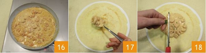 Continuez à mélanger les ingrédients avec une spatule pendant 3 minutes à feu moyen jusqu'à obtenir une crème de crevettes assez épaisse et homogène ; en fin de cuisson, assaisonnez avec du sel 16. Ensuite, prenez une crêpe et placez au centre une cuillère de la préparation 17. Sur la crème, découpez de petits morceaux de ciboulette en vous aidant de ciseaux 18.