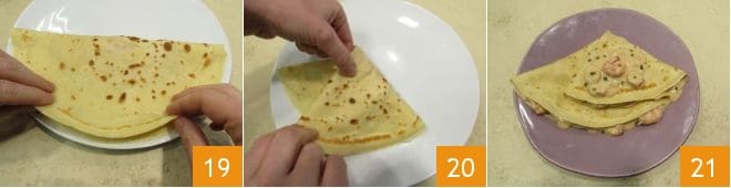 Maintenant, pliez la crêpe en deux 19 et ensuite en quartiers 20. Vos crêpes à la crème de crevettes sont maintenant prêtes à être servies 21.