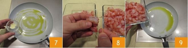 Passez maintenant à la préparation de la garniture. Dans une poêle à fond antiadhésif, versez un filet d'huile et faites revenir l'ail grossièrement coupé 7. Lorsqu'il est doré, retirez-le. Pendant que l'ail dore, préparez les crevettes et lavez-les abondamment à l'eau. Ensuite, enlevez l'intestin (pour la préparation des crevettes, consultez l'école de cuisine : Comment nettoyer les crevettes) 8. Ajoutez maintenant les crevettes dans la poêle 9