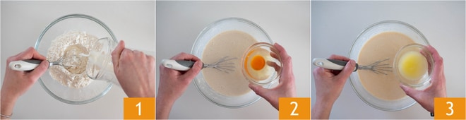 Pour préparer les galettes au jambon, brie et noix, versez dans un bol la farine, commencez à mélanger avec le fouet tout en versant le lait 1 : vous devez obtenir une pâte fluide et sans grumeaux. Ajoutez ensuite une pincée de sel, l'œuf 2 et enfin le beurre fondu 3.