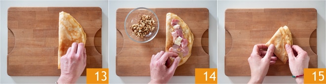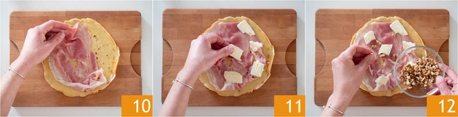 Garnissez chaque galette d'une tranche de jambon 10, quelques morceaux de brie 11 et une poignée de cerneaux de noix émiettés à la main 12.