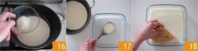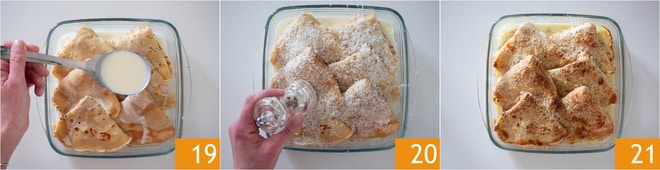 Passez à l'assaisonnement : chauffez la crème dans une casserole à feu doux, puis ajoutez 30 g de Parmesan 16 et laissez-le fondre en remuant. Ajustez le sel et le poivre à votre goût. Versez la moitié de cette sauce dans un plat à gratin 17, disposez les galettes 18.