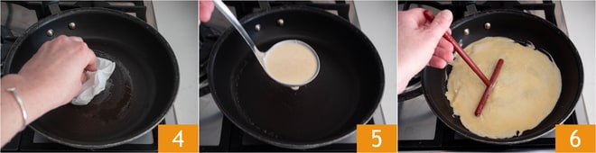 Chauffez la crêpière (ou une poêle antiadhésive), graissez avec un peu de beurre à étaler avec une feuille de papier absorbant 4. Versez une louche de pâte 5 et tournez pour l'étaler uniformément sur le fond (ou utilisez un râteau à crêpes pour couvrir toute la surface) 6.