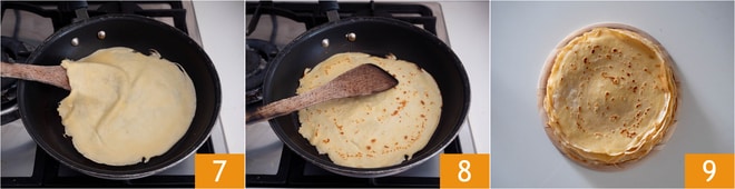 Dès que la galette est cuite d'un côté, retournez-la 7 et terminez la cuisson 8. Empilez les galettes prêtes sur une assiette au fur et à mesure 9.