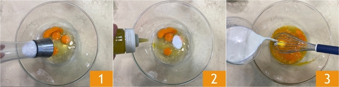 Pour préparer les crêpes aux épinards avec saumon, commencez par casser les œufs dans un bol, puis ajoutez le sel 1, l'huile 2 et le lait 3. Mélangez bien avec un fouet à main.