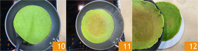 Faites cuire à feu moyen-doux jusqu'à ce que les bords commencent à se détacher 10, puis retournez la crêpe et faites cuire de l'autre côté pour un total d'environ 3 minutes 11. Retirez la crêpe de la poêle et empilez-les au fur et à mesure sur une assiette 12 ; avec ces quantités, vous obtiendrez environ 10 crêpes aux épinards.