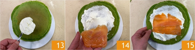 Après avoir cuit toutes les crêpes, procédez à la garniture : étalez le fromage frais sur toute la surface 13, puis déposez quelques tranches de saumon fumé 14. Repliez d'abord les côtés vers l'intérieur 15.