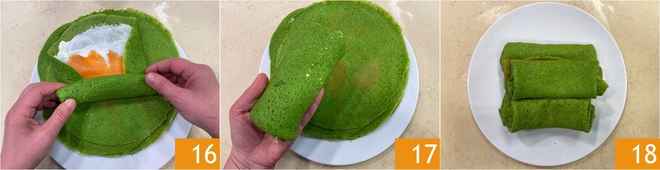 Une fois les côtés repliés, roulez la crêpe 16 pour sceller la garniture 17. Procédez de cette manière pour garnir toutes les autres. Vos crêpes aux épinards avec saumon sont prêtes à être dégustées 18 !