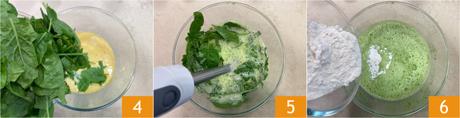 Ajoutez les épinards frais, lavés et bien essorés 4, et mixez avec un mixeur plongeant 5 jusqu'à obtenir un mélange lisse et homogène. À ce stade, incorporez la farine 6.